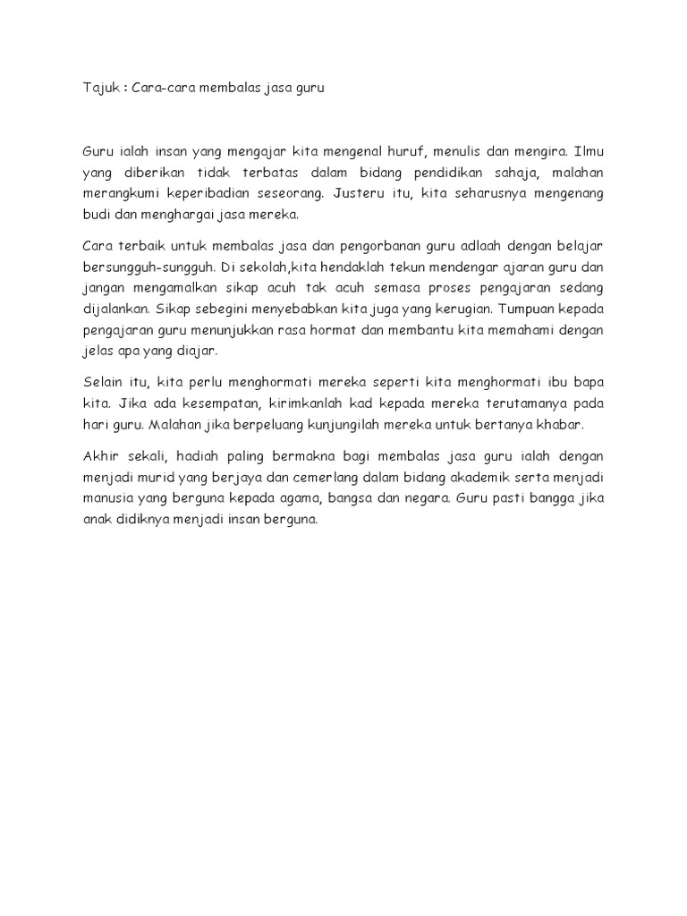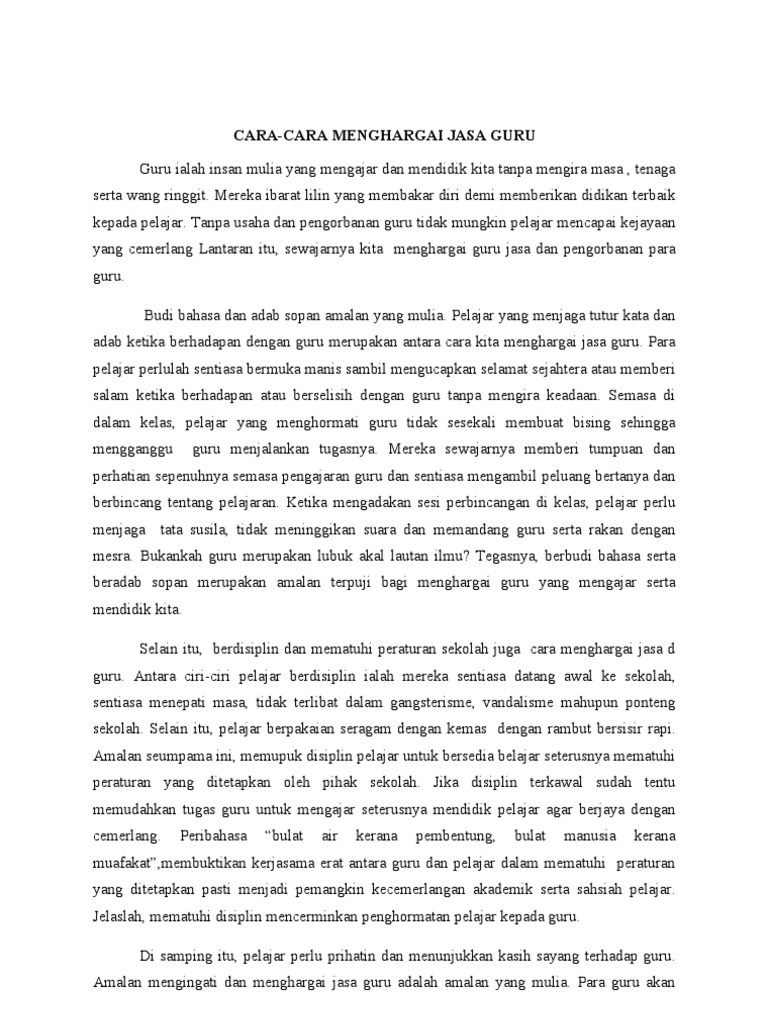 Contoh Karangan SPM CARA-CARA MENGHARGAI JASA GURU Sasterawan Negara Datuk Usman Awang pernah menyatakan bahawa lahirnya seorang Perdana Menteri doktor peguam. Hari Guru disambut pada 16 Mei setiap tahun sebagai tanda memperingati dan. Sememangnya pengorbanan dan jasa guru tidak mampu diungkapkan dengan kata-kata.